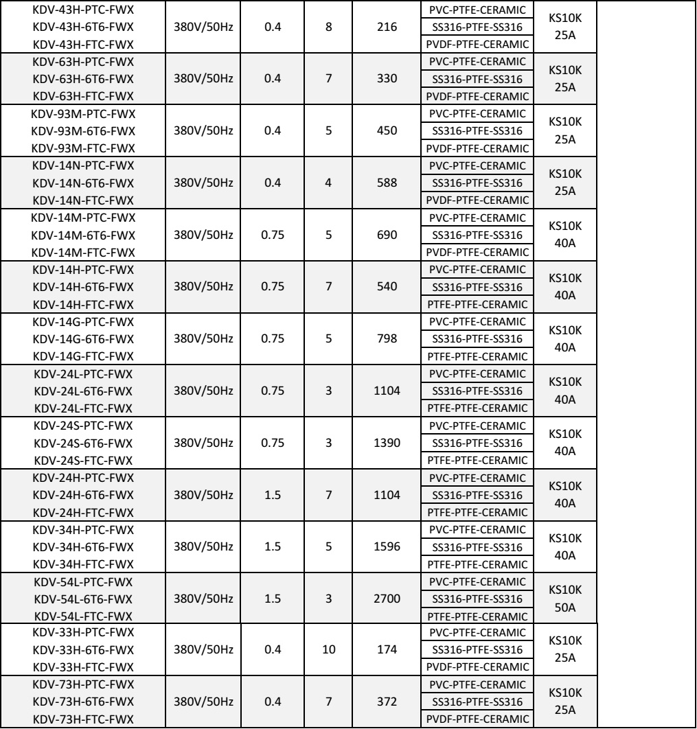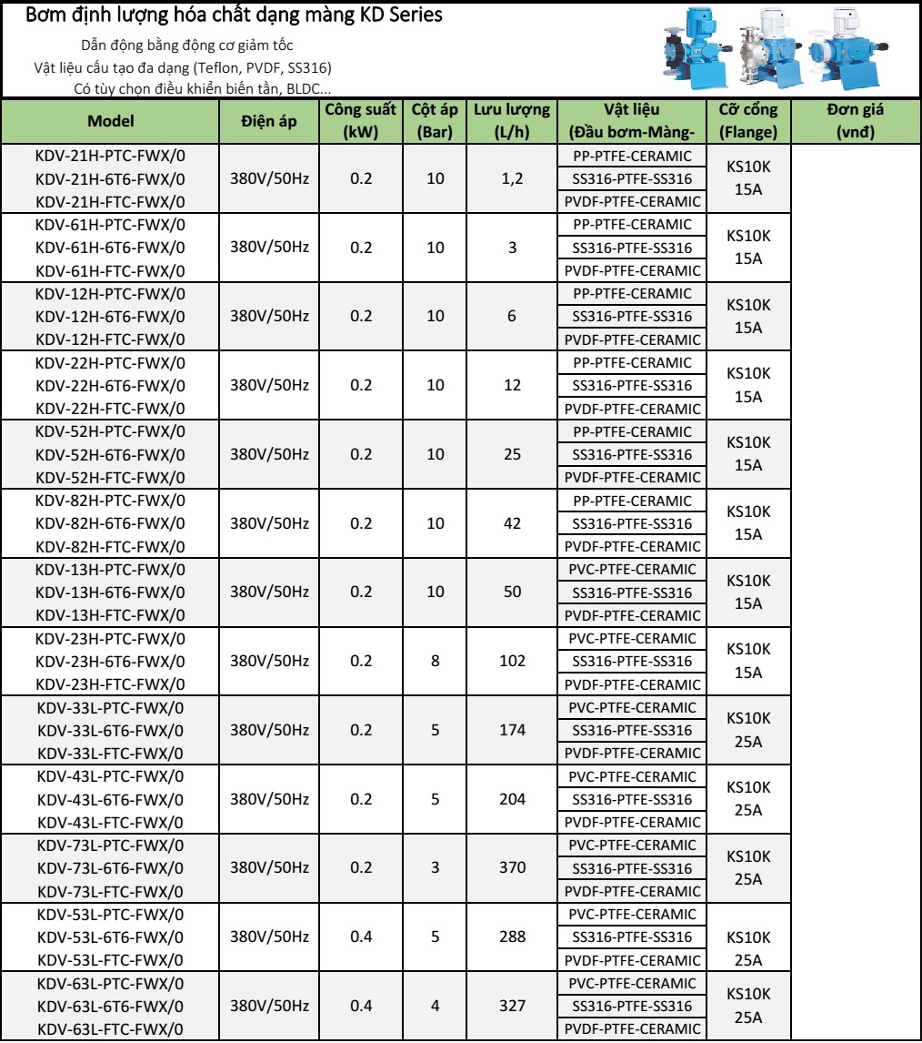 - Đầu bơm được chế tạo từ : PP PVC, PVDF